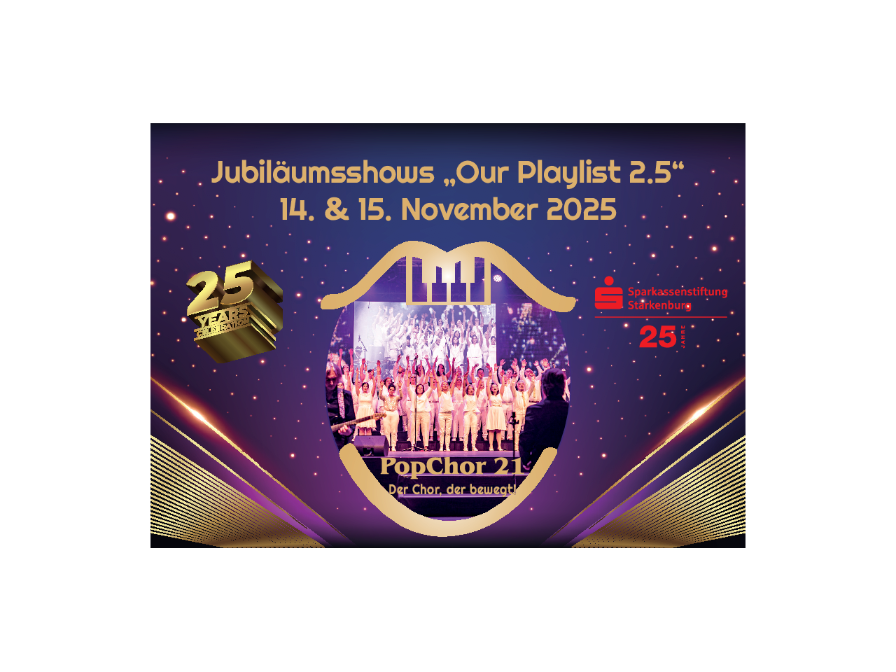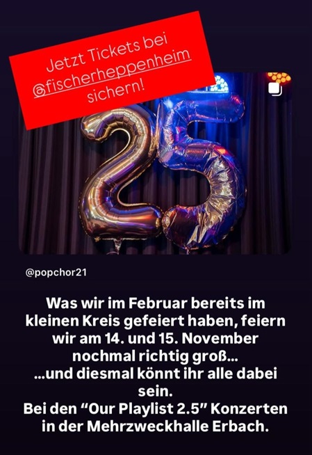 Es dauert nicht mehr lange! Die großen Jubiläumsshows des PopChor 21 zum 25jährigen Bestehen des Chors werden am 14. und 15.11.2025 in der Mehrzweckhalle in HP-Erbach unter dem Motto "Our Playlist 2.5" - jeweils mit anschließender After-Show-Party gefeiert. Für beide Tage sind noch Tickets bei Raumausstattung Fischer, Friedrichstraße 15 (Fußgängerzone), in HP erhältlich. Wir freuen uns auf euch und wollen eine tolle Show mit vielen Gänsehautmomenten bieten.
